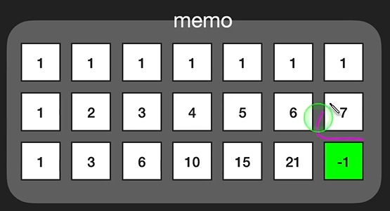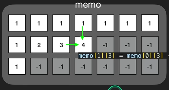 memo[1][1] 부터는 memo[0][1]값과 memo[1][0]값을 더한값 즉 관계식이 성립