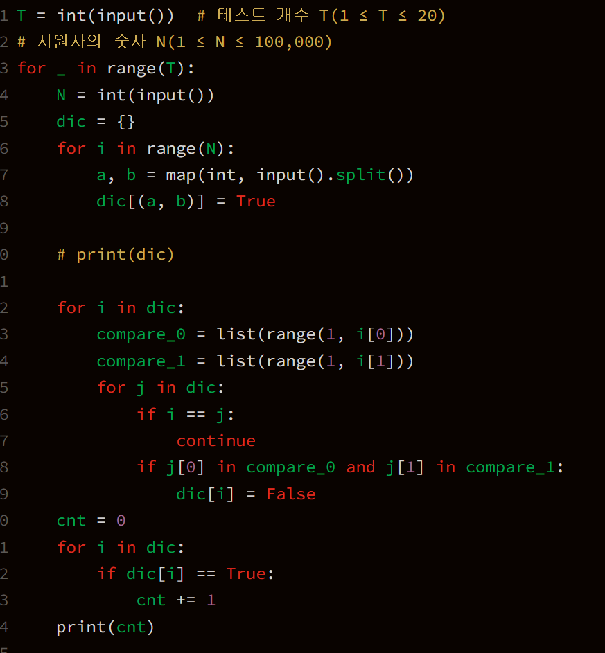 첫째 줄에는 테스트 케이스의 개수 T(1 ≤ T ≤ 20)가 주어진다. 각 테스트 케이스의 첫째 줄에 지원자의 숫자 N(1 ≤ N ≤ 100,000)이 주어진다. 둘째 줄부터 N개 줄에는 각각의 지원자의 서류심사 성적, 면접 성적의 순위가 공백을 사이에 두고 한 줄에 주어진다. 두 성적 순위는 모두 1위부터 N위까지 동석차 없이 결정된다고 가정한다.